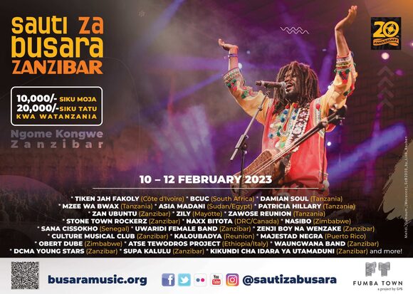 Februari 10 hadi 12, 2023, Sauti za Busara itaadhimisha miongo miwili iliyotumika kutafiti, kufufua na kutambulisha muziki wa asili ya Kiafrika kutoka kwa wakongwe wa tasnia hii, vipaji vipya, haswa kutoka kwa wanamuziki wa kike na bendi zinazoongozwa na wanawake, na sauti chache za thamani zilizosahaulika katika historia ya muziki. Punguzo kubwa la bei ya tiketi hutolewa kwa raia wa Tanzania, wakaazi wa EAC, na wote walio na pasipoti za Kiafrika.